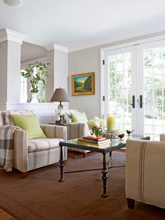 Focus on the View : An effective room arrangement starts with the focal point, the cornerstone of your living room design. Typically a fireplace plays this role, but in this contemporary cottage space, the view out the French doors takes center stage instead. Orient the main seating piece toward the focal point and arrange the secondary seating pieces around the main piece. In winter, the room could be rearranged to focus on the fireplace.